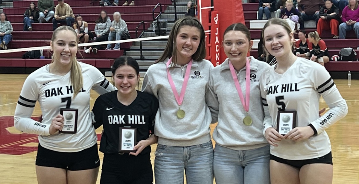 The following Oak Hill Volleyball team members were presented District 13 Volleyball Awards. Pictured (L to R) are Emma Figgins (DV 1st Team); Bailee Lahrmer (DV 1st Team); MaKayla Davidson (DV Honorable Mention); Hunter Blevins (DV Honorable Mention); and Alyssa Whitt (DV 2nd Team). Click image for larger view. November 2025