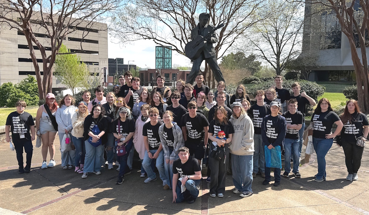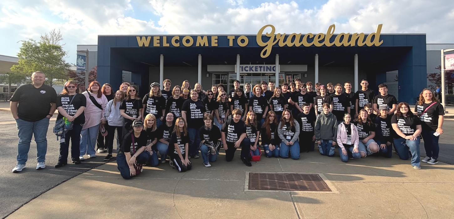 The Oak Hill Band and Choir traveled to Memphis, Tennessee March 26-29th. The Oak Hill Concert Band performed in an adjudicated performance at the University of Memphis, receiving a superior rating. The students saw the sites of Memphis including Elvis’s Graceland, the Memphis Queen riverboat, Sun Studios, Stax Records, the National Civil Rights Museum, and the Bass Pro Shop Pyramid. Click images for larger view.